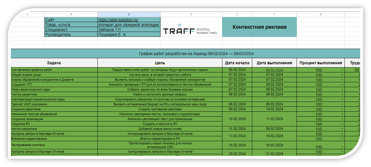 Затем мы приступили к сбору и кластеризации семантического ядра. После работы над семантикой мы приступили к написанию релевантных заголовков, подзаголовков и текстов объявлений. Выполнив всего подготовительные этапы мы запустили рекламные кампании
