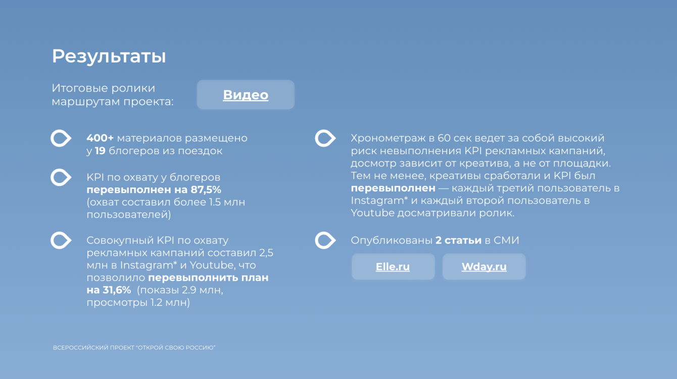 Сжатые сроки на подготовку и выезд в 19 туров за 1,5 месяца не помешали нам снять классные имиджевые ролики, привлечь активных блогеров и рассказать жителям России о красотах нашей страны!