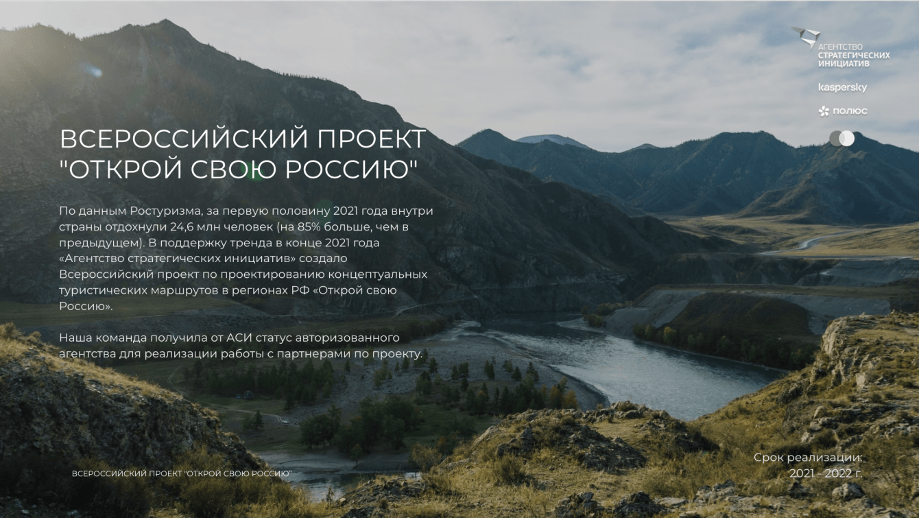 Идея: Россия богата интересными местами, потрясающими пейзажами, талантливыми ремесленниками, необычными блюдами и т.д. И всё это можно найти в разных уголках страны. Жители России так мало знают о том, какие места посетить в России. Поэтому для реализации проекта были выбраны максимально охватные каналы и видео-формат как основной способ рассказа о турах Всероссийского проекта “Открой свою Россию”.