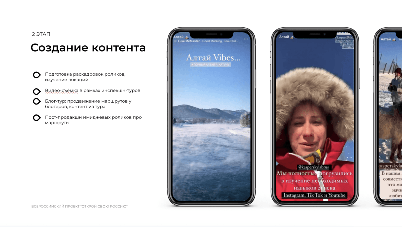 Идея: Россия богата интересными местами, потрясающими пейзажами, талантливыми ремесленниками, необычными блюдами и т.д. И всё это можно найти в разных уголках страны. Жители России так мало знают о том, какие места посетить в России. Поэтому для реализации проекта были выбраны максимально охватные каналы и видео-формат как основной способ рассказа о турах Всероссийского проекта “Открой свою Россию”.