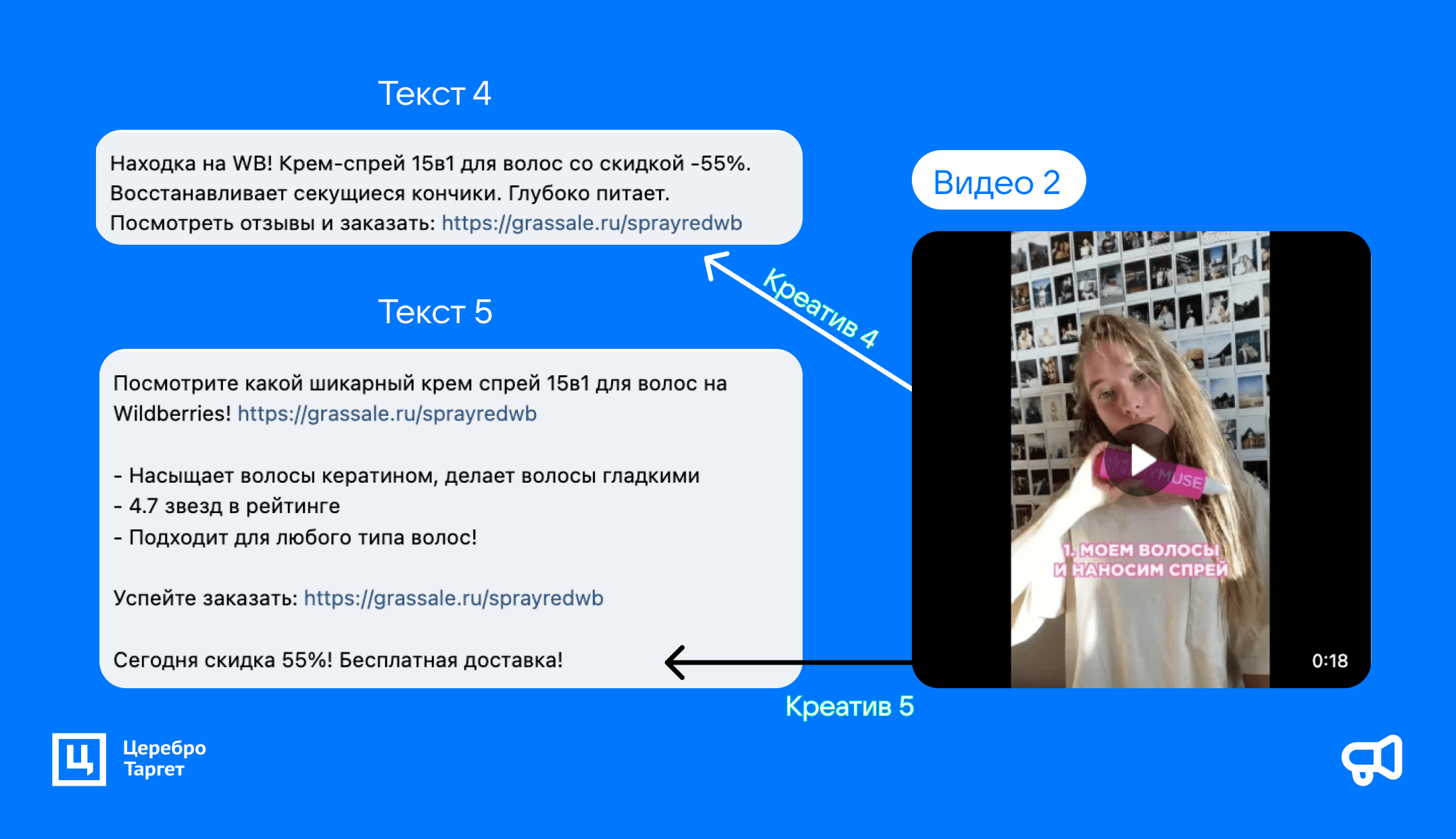 4. Отключили провальный креатив и запустили на тест новые креативы. Предположили, что причина неуспеха может быть в недостаточно цепляющем видео. Поэтому для новых объявлений взяли видео с другим блогером и два текста из первой тройки креативов.