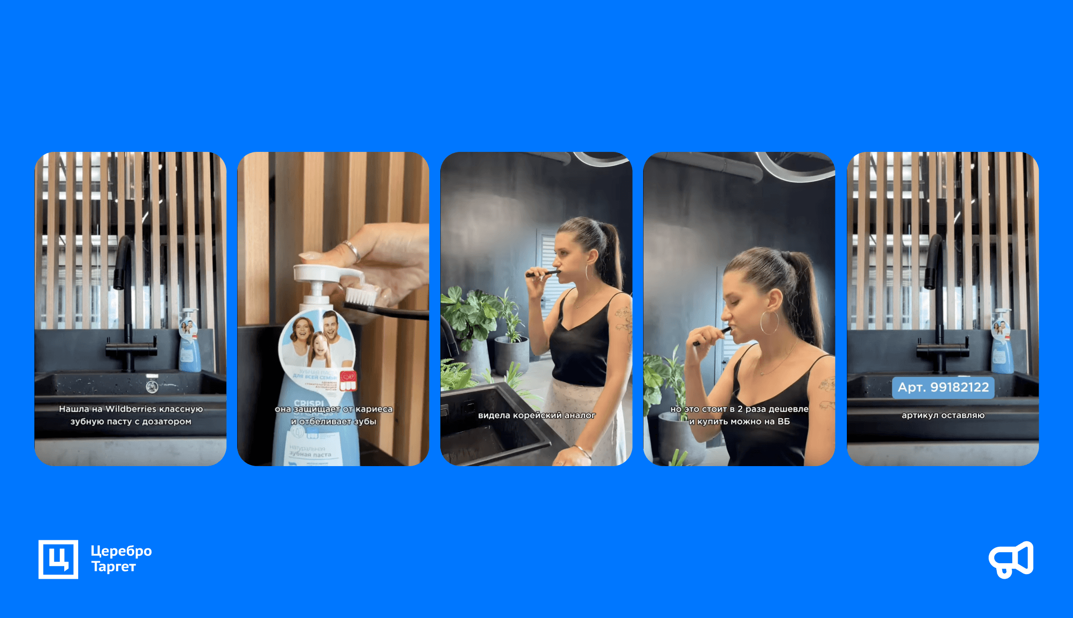 Сценарий с процессом использования товара. На видео тот же блогер, тот же товар и текст. Только в этом варианте есть видеоряд с использованием зубной пасты: кадры из ванной комнаты → выдавливание пасты → процесс использования.