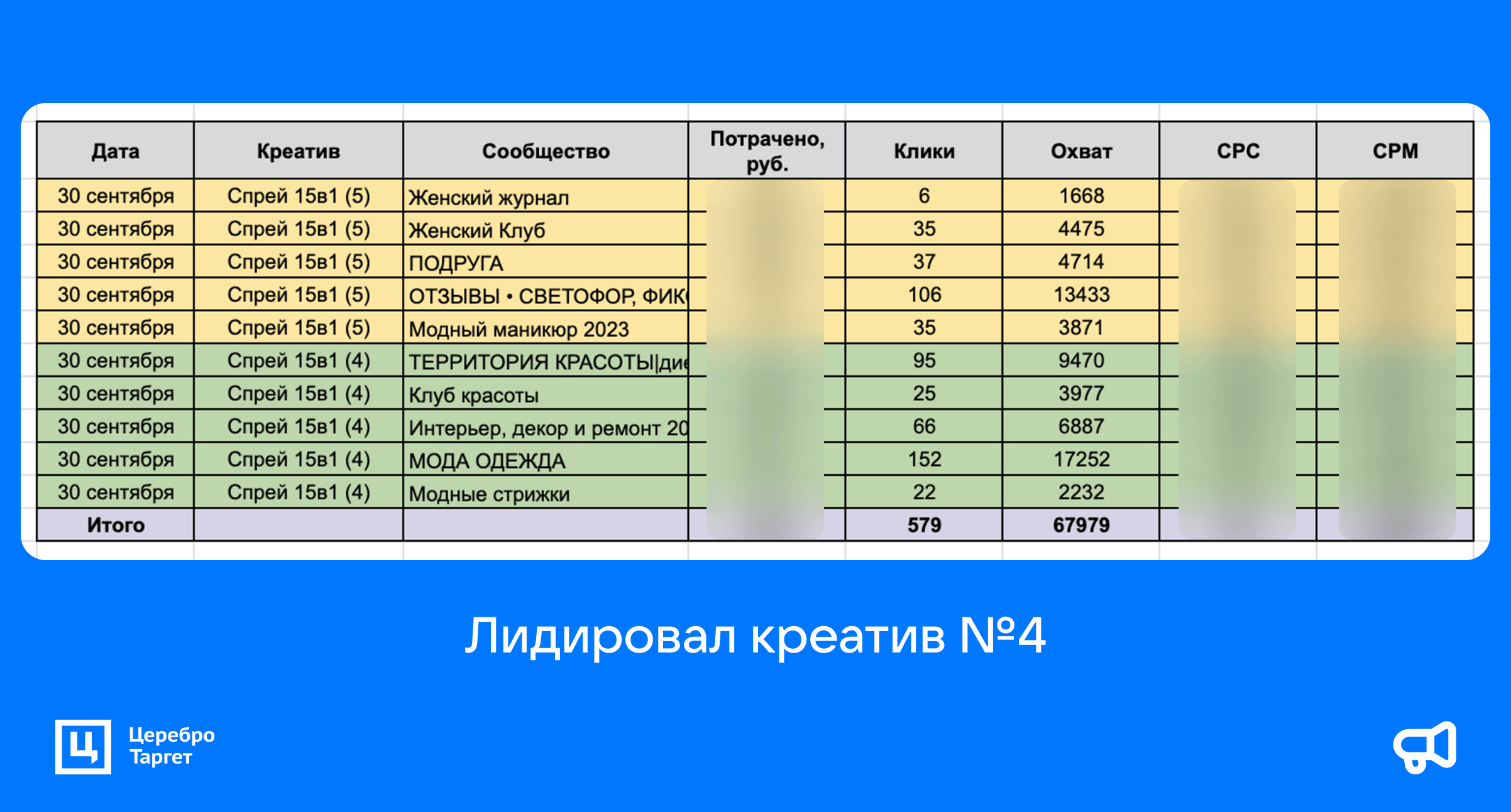 5. Выявляем нового лидера. В случае с тестом термозащитного спрея, лидировал креатив №4. Цена клика в пределах 10 руб, что еще выгоднее, чем при первом раунде тестов. Креатив №5 тоже укладывался в KPI, но остановиться решили на креативе №4, так как он выгоднее. На пробном масштабировании с другими сообществами он также показал низкую стоимость клика.
