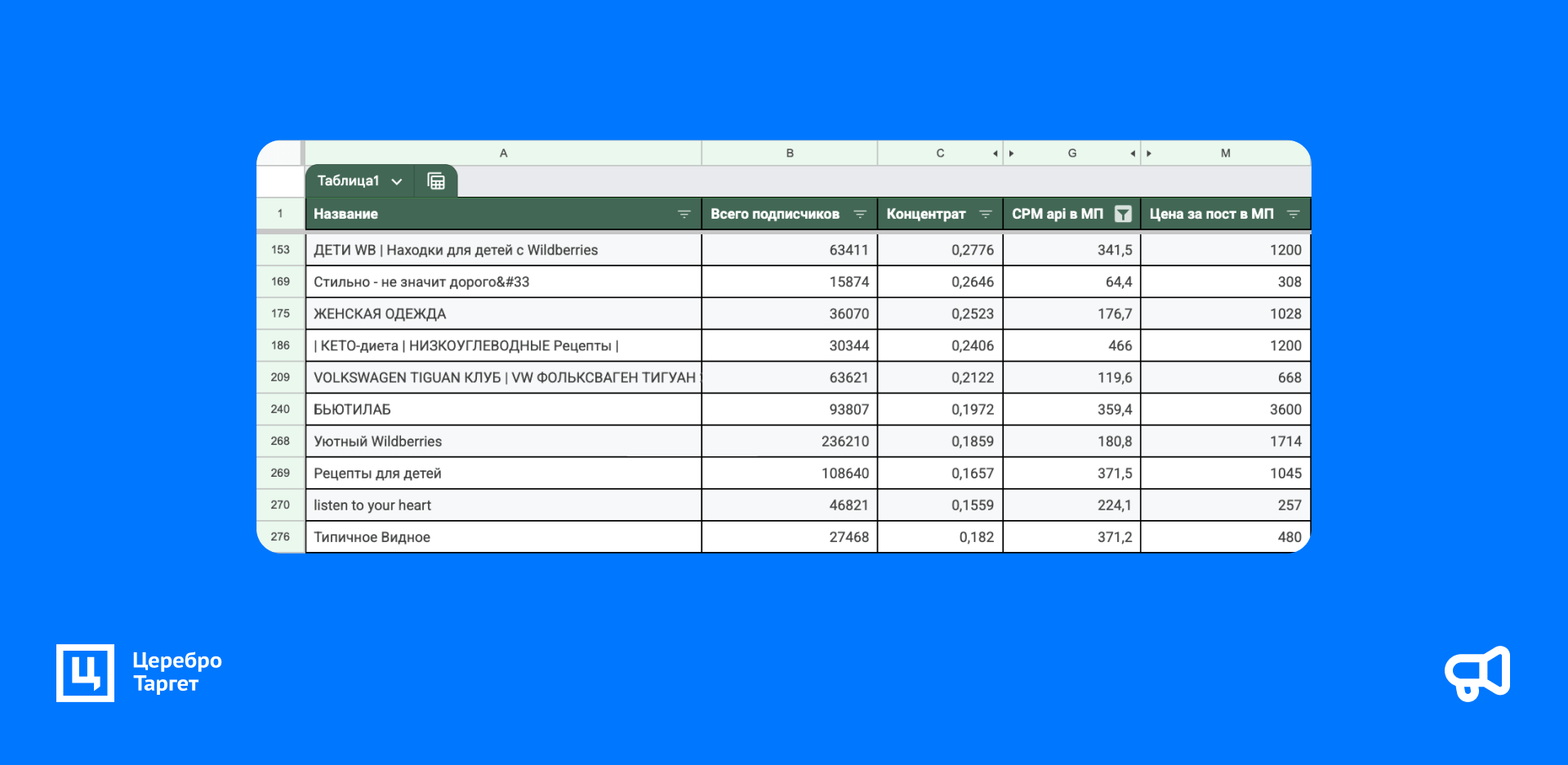 На этом шаге оставили в таблице только те сообщества, которые подходили по охвату постов, СPM, возрасту, полу, коэффициенту концентрата и другим параметрам.