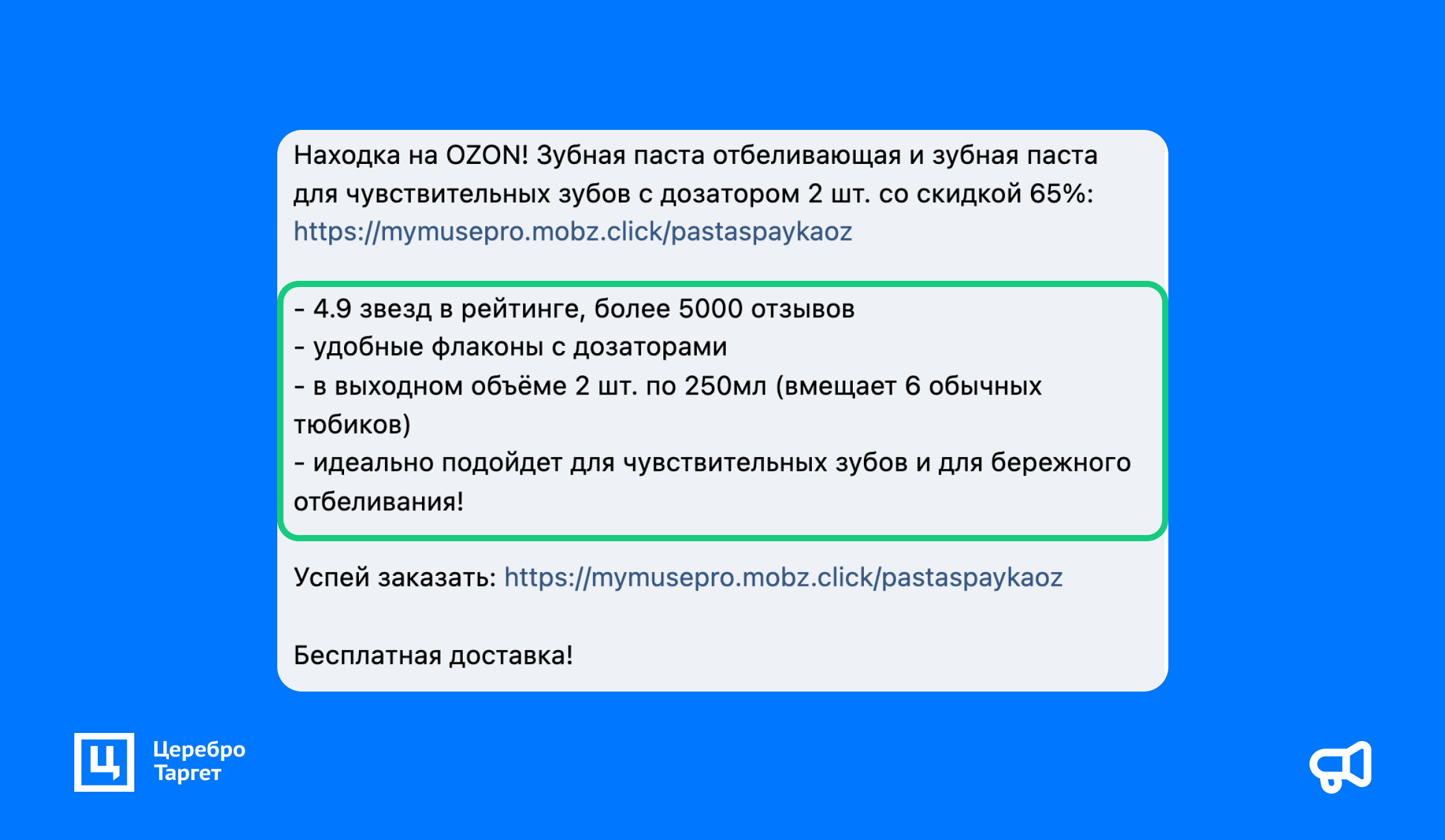 3. Призыв к действию: дублируем ссылку, используем триггер срочности или дефицита: «Успейте заказать!», «Забирай по скидке, пока не разобрали».
