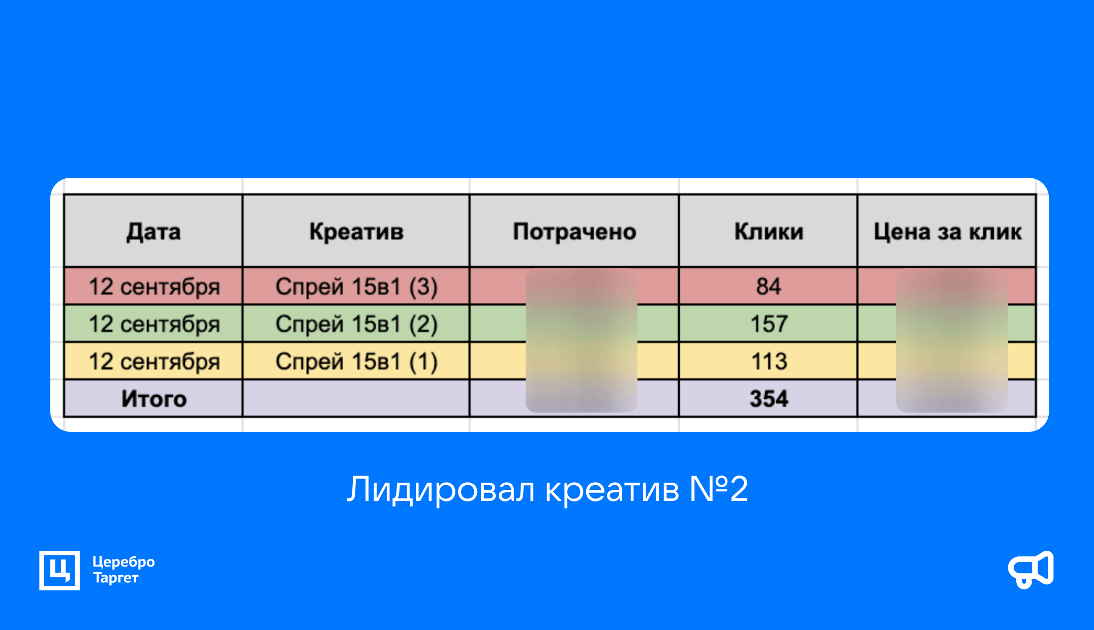 Что было дальше: креатив №4 выгорел только спустя 2,5 месяца, но к тому моменту мы создали новые креативы для спрея и протестировали по такому же алгоритму. В 2025 году товар откручиваем до сих пор, так как он востребован у ЦА.