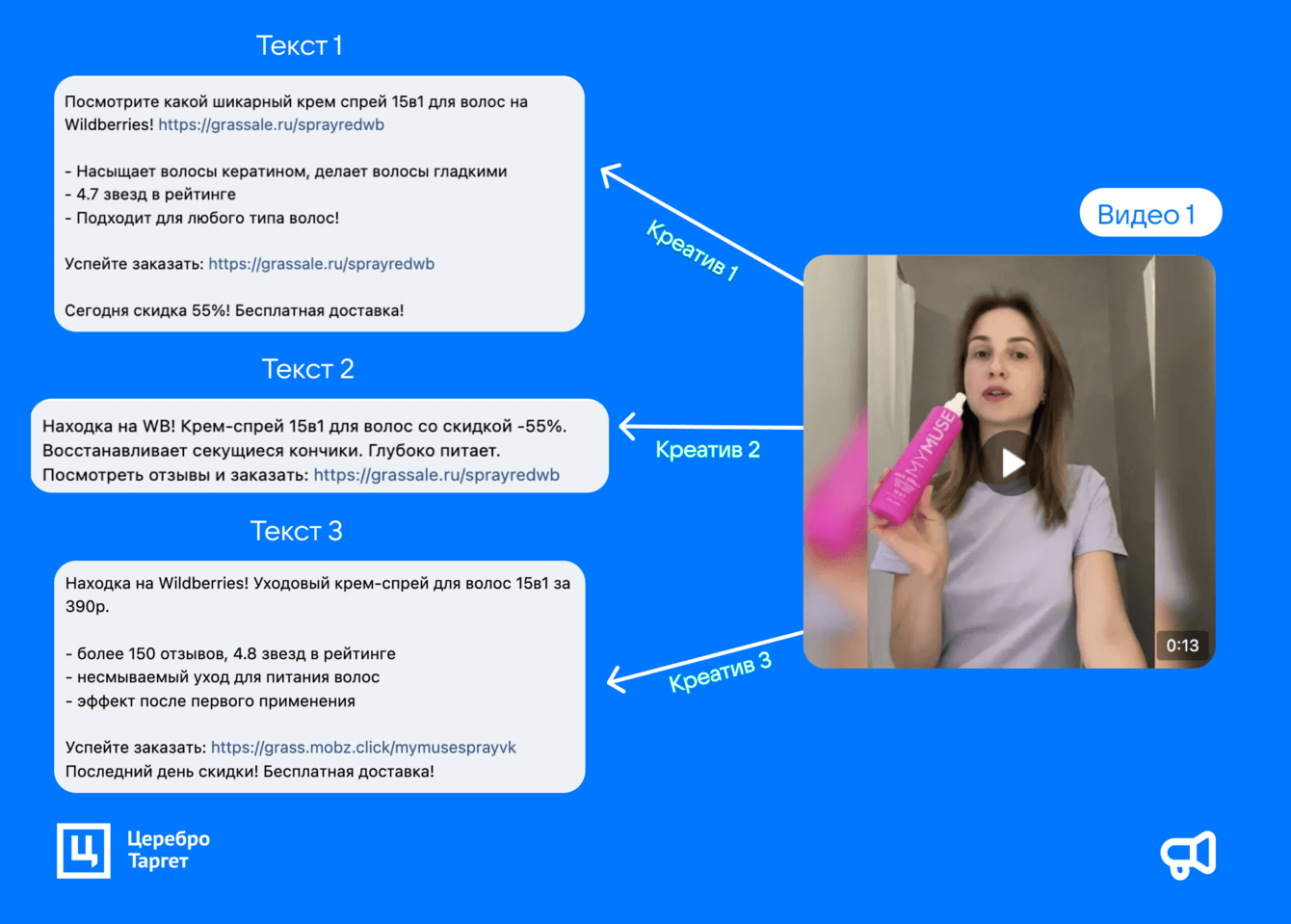 1. Создаем тройку креативов на основе одного видео и трех текстов. Выделили минимум необходимого бюджета на каждый креатив. Запустили открут на один день, каждый креатив тестировали в 6-7 разных сообществах.