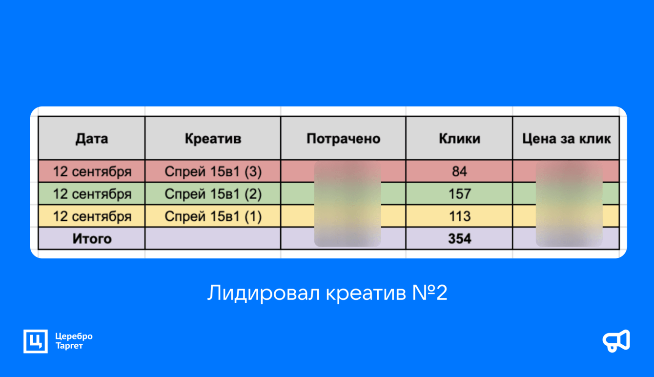 2. Выявляем лидера на следующий день. Самым эффективным оказался креатив от блогера в комбинации со вторым текстом — креатив №2. Он принес 157 кликов по цене до 15 руб (указан неточный CPC из-за NDA).