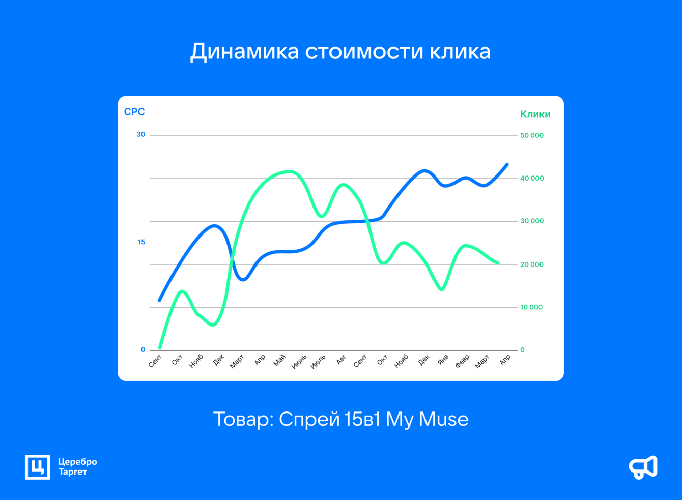 На примере спрея My Muse на графике выше видно, что со временем мы закупали все больше трафика. Пропорционально рос и CPC. Начиная с августа-сентября 2024 года стали закупать меньше трафика, но так как частота показа объявлений на одного человека уже выросла, стоимость клика продолжила расти.