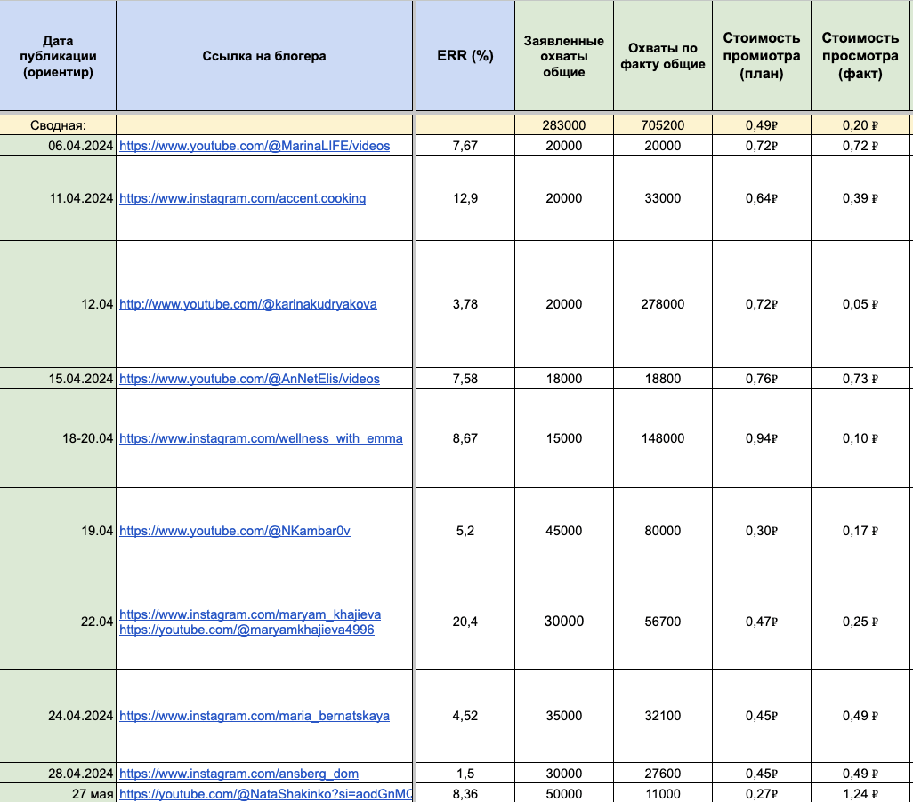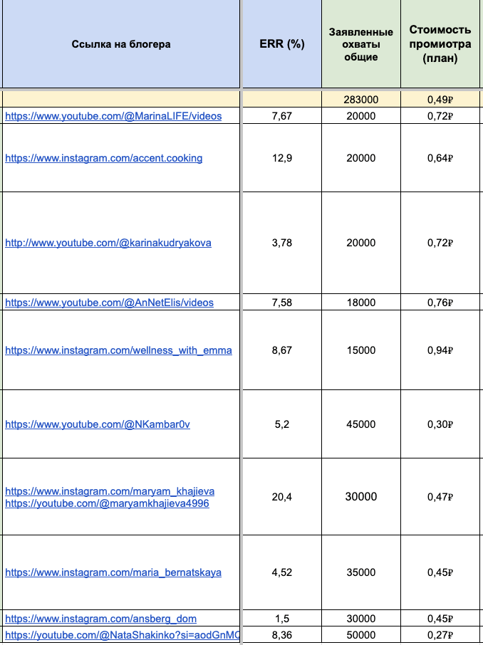 После выявления трех основных тематик, мы приступили к подбору блогеров и анализу их статистики: заявленные охваты, план по стоимости просмотра, а также показатель ERR, который помогает оценить, насколько публикации были вовлекающими для тех, кто увидел reels / shorts / ролик на YouTube.
