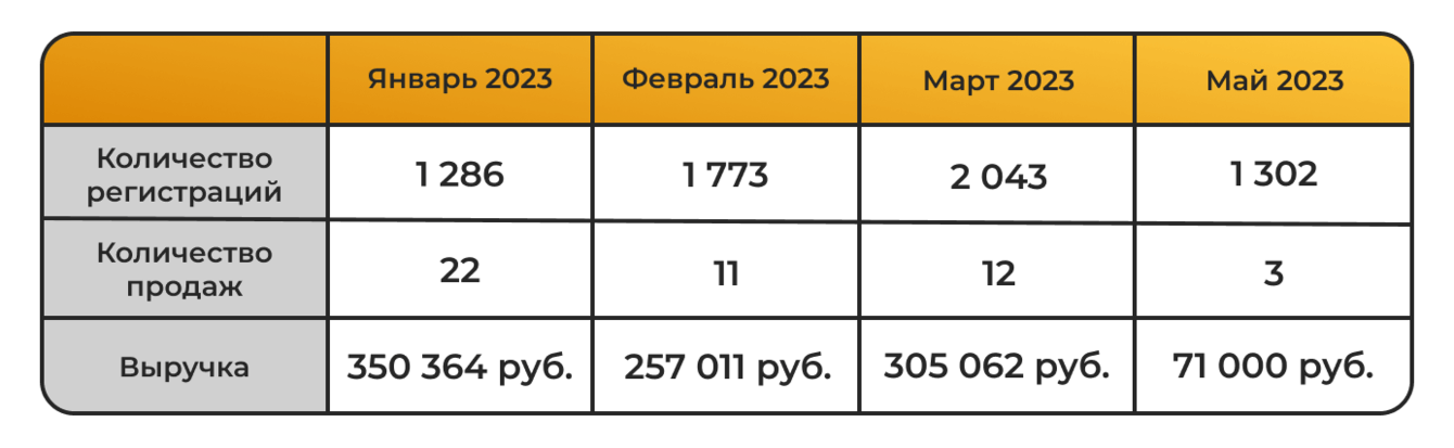 Вместе с заказчиками заметили, что при среднем результате в 1500 регистраций за месяц конверсия в продажи была крайне низкая и составила менее 1%.