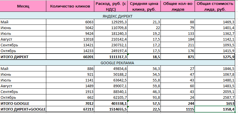 За полгода работы нам удалось в сумме из двух каналов получить 1115 лидов. Итоговая средняя стоимость заявки: 1276 руб. в Директе и 1653 руб. в Google. Максимальное количество заявок в месяц – 254. Каждый месяц план по количеству заявок стабильно выполнялся. При этом, благодаря постоянной оптимизации и детальной проработке РК за все время работы с проектом наблюдалась положительная динамика – прирост количества заявок. Минимальная цена клика – 17,2 руб в Директе, 46,3 руб в Google.