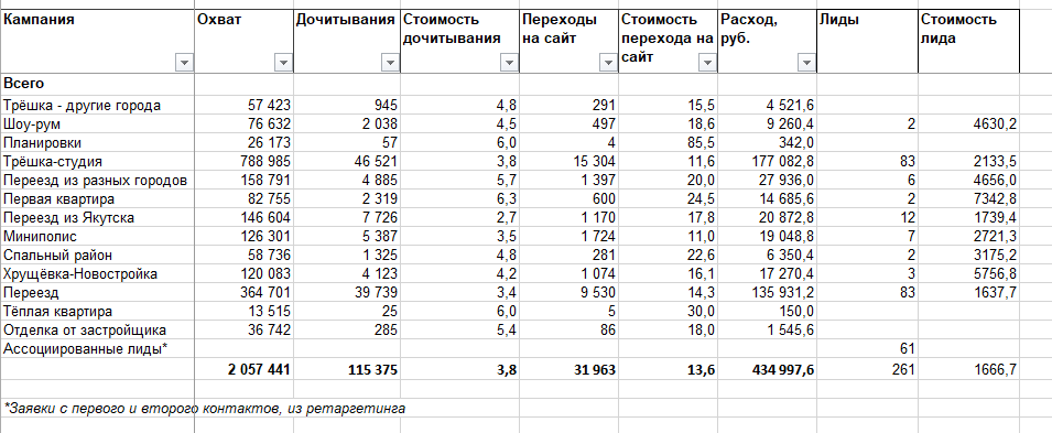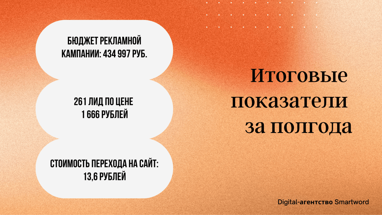Первая статья сразу начала набирать прочтения при ставке 6 руб. за дочитавшего. В первые три дня мы получили 5 заявок с первого контакта от людей, которые перешли на сайт после прочтения статьи. Решили снизить стоимость дочитывания в два раза и на столько же увеличить дневной бюджет. В последующие 4 дня мы получили ещё 18 заявок, а итоговая стоимость заявки с первого контакта снизилась до 1800 рублей. Со следующих статей получили заявки по цене 1200 рублей за лид.