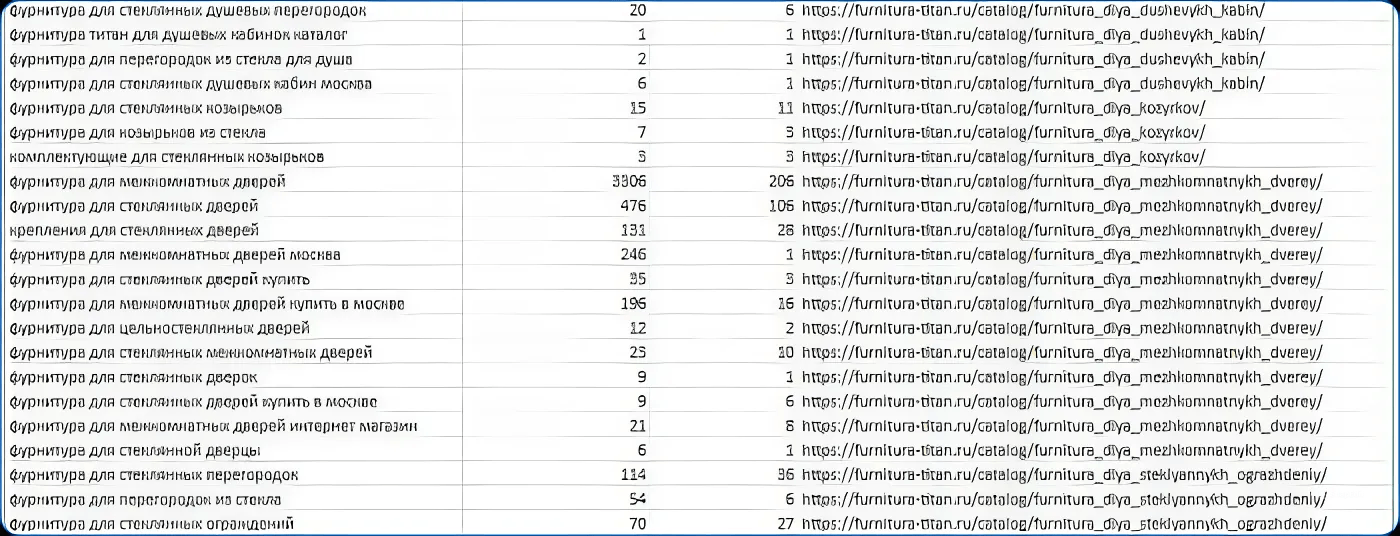 Все ключевые запросы были отсортированы, чтобы далее распределить их по страницам сайта. Пример: