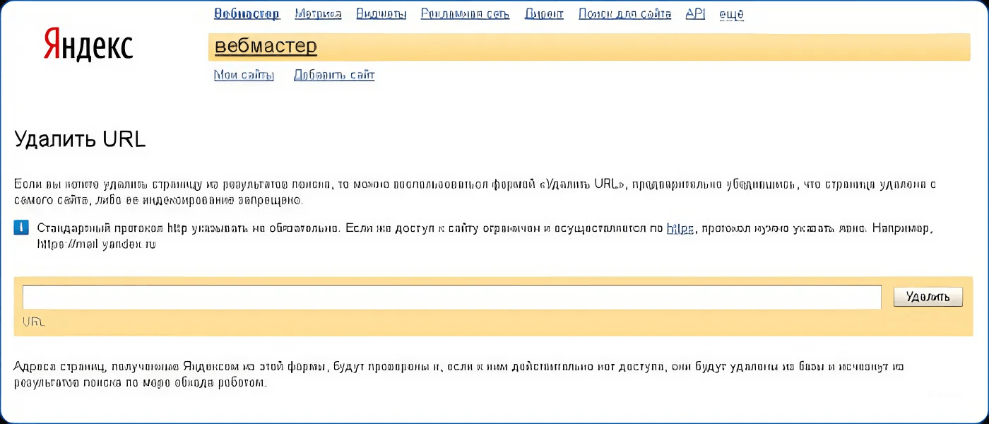 ● Некоторые страницы мы удаляли из поисковой выдачи Яндекса через сервис удаления url в Яндекс.Вебмастер. Удалить страницу со ссылкой можно, если она соответствует одному из трёх условий: сервер возвращает 404, страница запрещена к индексации через robots.txt или с помощью метатега noindex. В основном мы удаляли по 404.