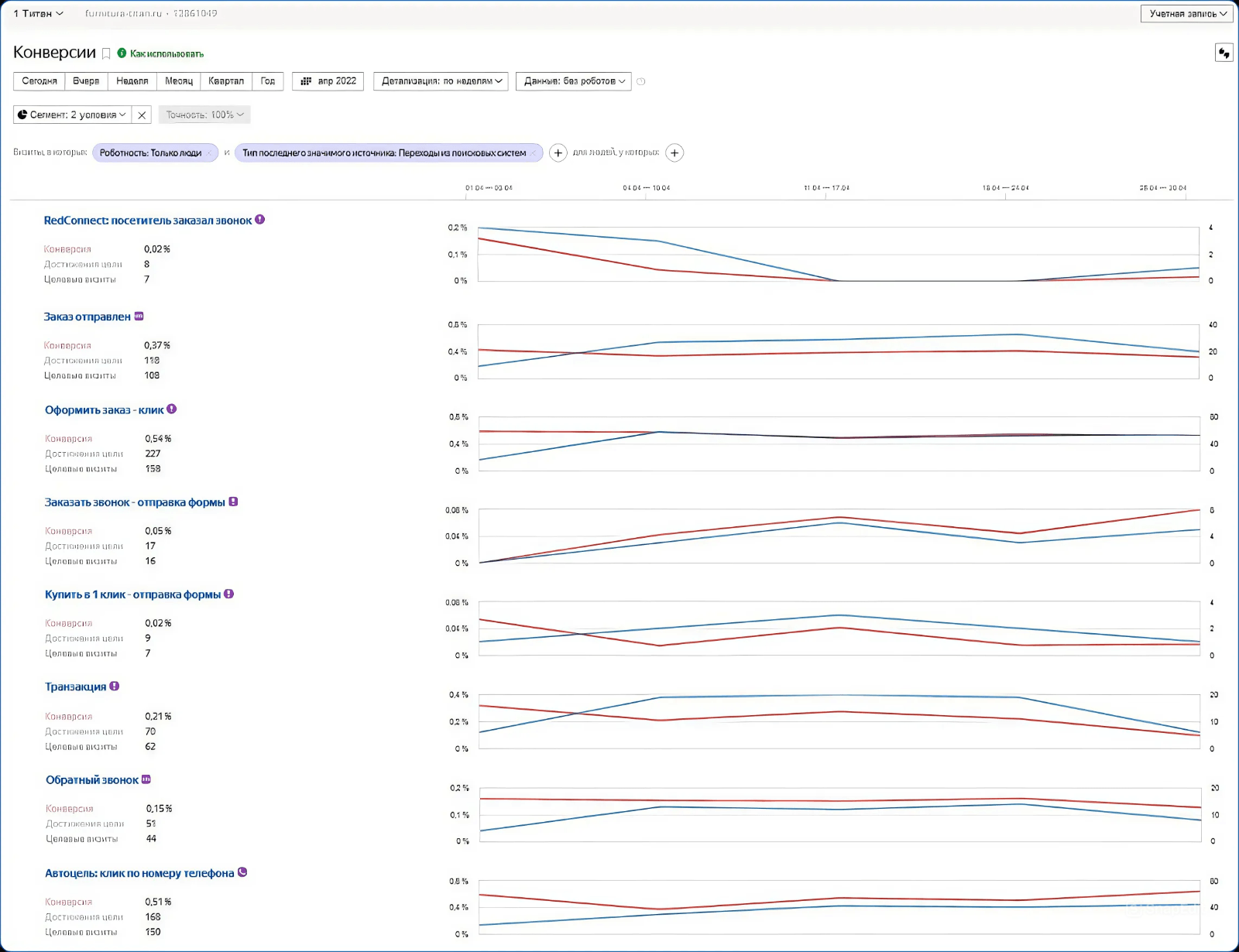 Проанализировали конкурентов клиента (тех, кого он назвал нам сам, и из поисковой выдачи). Предложили клиенту большой перечень доработок юзабилити сайта, т.е. степени его понятности и удобства для совершения конверсионных действий (звонков, отправки заявок, покупок). После каждой правки обязательно тестируем, принесла ли она ожидаемый результат.