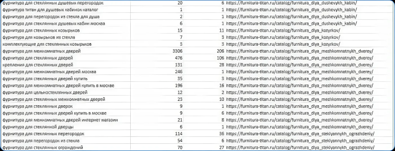 Собрали максимально полное семантическое ядро. Регулярно его обновляем, добавляя новые ключевые слова, с помощью которых целевая аудитория клиента находит его сайт. Приоритет на ключевые слова по наиболее популярным товарам и гео-запросы.