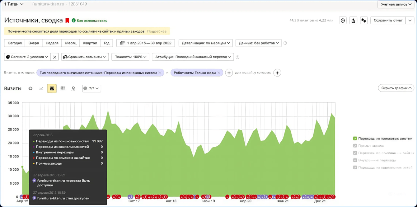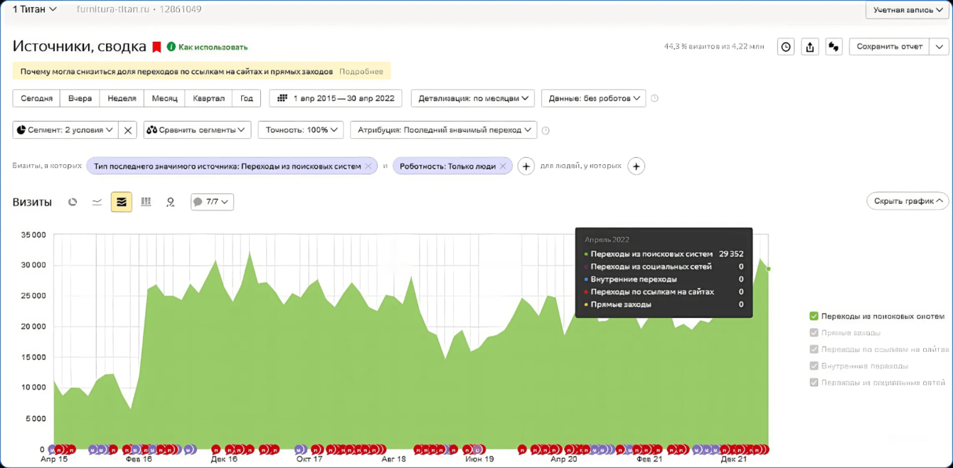 Конечно, ссылочное продвижение применяют практически все. При неосторожном использовании этого метода — слишком быстром росте ссылочного профиля сайта или выборе неподходящих сайтов-доноров, поисковые роботы заметят это, и сайт потеряет позиции. Так и произошло с интернет-магазином клиента, после чего он обратился к нам.