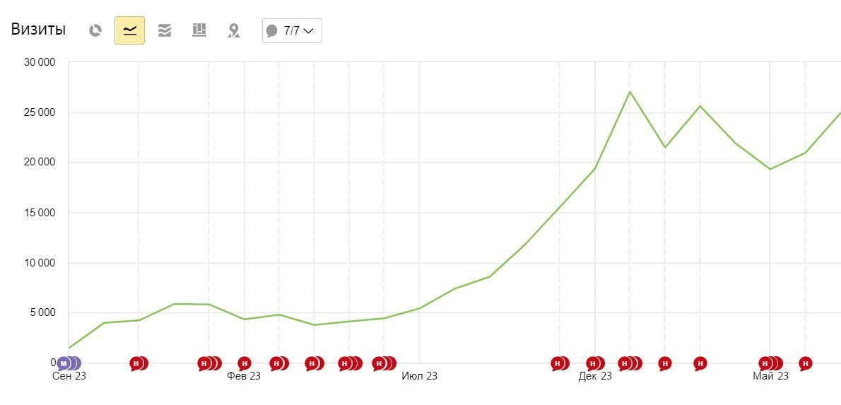 За 18 месяцев работы по продвижению сайта визиты из поисковых систем выросли в 6 раза. За июнь 2018 года - 4150, за август 2019 года - 25800 визитов. В качестве системы статистики использовалась Яндекс.Метрика.