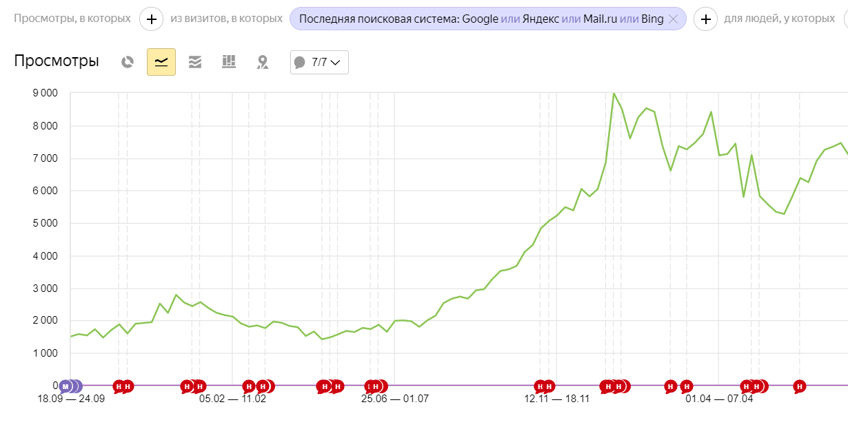 Просмотры из поисковых систем выросли в 5 раз за 18 месяцев работы по продвижению сайта. За июнь 2018 года - 7686, за август 2019 года - 36563 просмотров страниц.