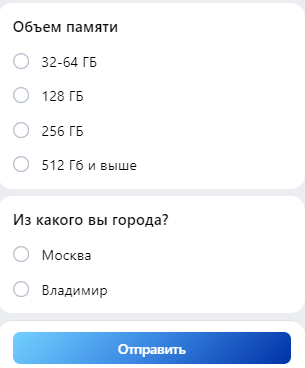 Для услуги trade-in была разработана специальная форма для сбора информации о пользователях, заинтересованных в товаре. В новой лид-форме клиенты оставляли заявки на оценку своего устройства. Наличие дополнительных вопросов о модели и объёме памяти, а также указание города помогло улучшить качество трафика. В результате лиды стали более осознанными, ведь пользователям приходилось тратить время на заполнение заявок.