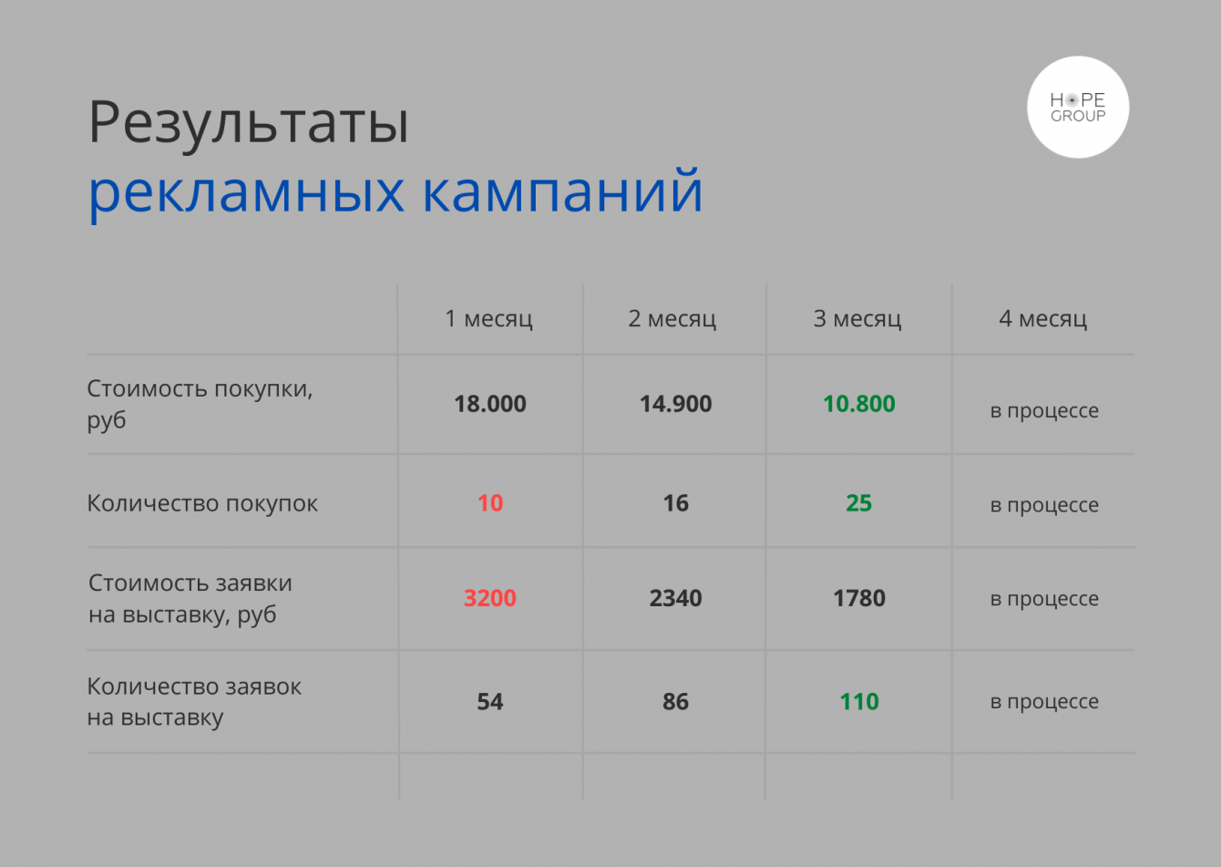 Основная задача на второй месяц в том, чтобы оптимизировать успешные кампании и снизить стоимость оформления заказа и заявки. В процессе работы обязательно корректируем группы объявлений: