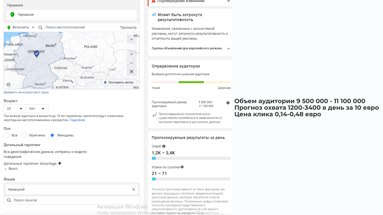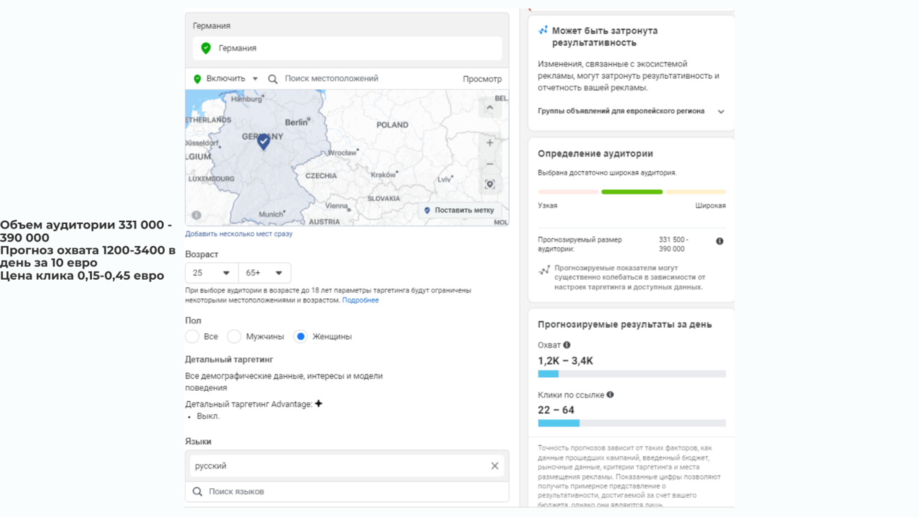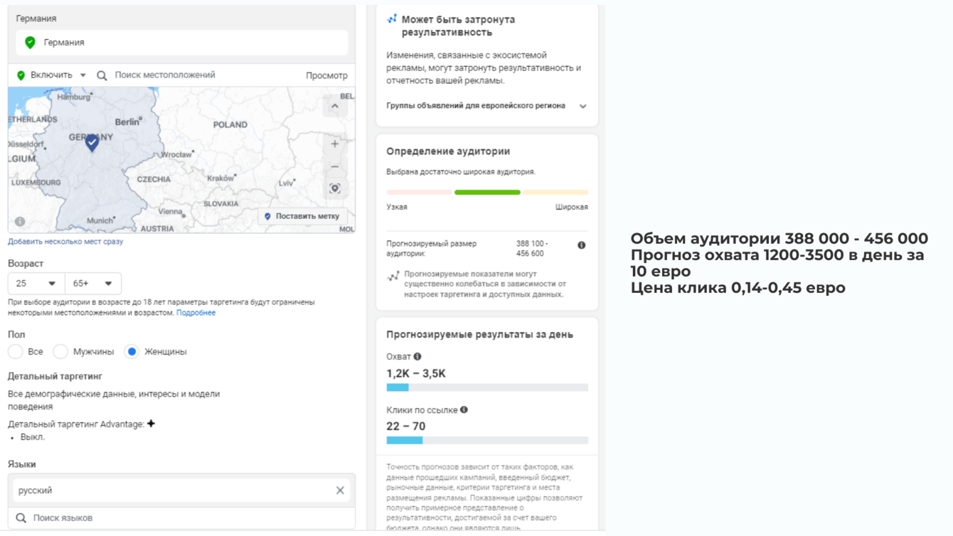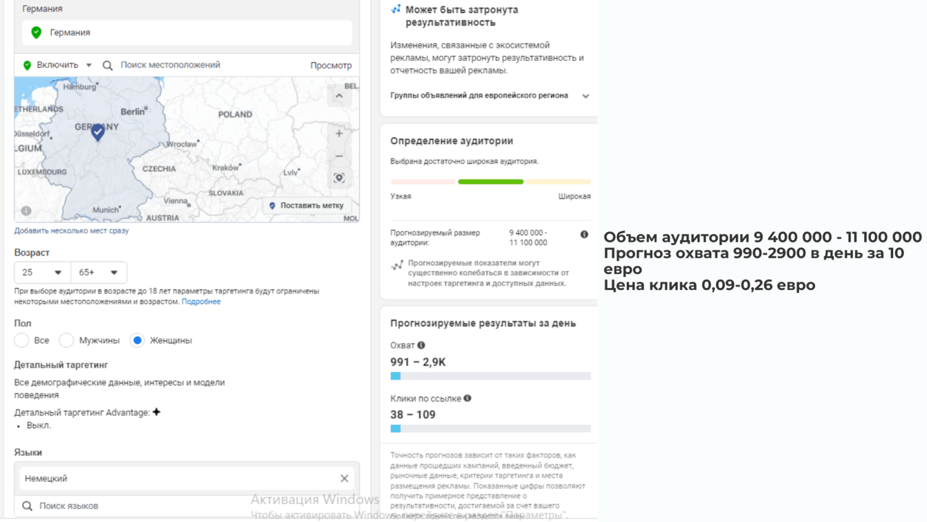 Объем аудитории. Женщины 25+ facebook. Русский язык. Германия