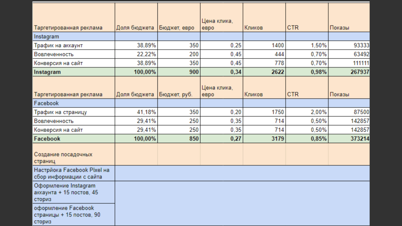 Общая сумма, потраченная на кампанию, составила €459,78. Это может показаться довольно дорогой кампанией, и, возможно, стоит рассмотреть оптимизацию сайта для улучшения её эффективности. На данный момент сайт не соответствует стандартам, предъявляемым к инстаграмной картинке, и это может влиять на конверсию.