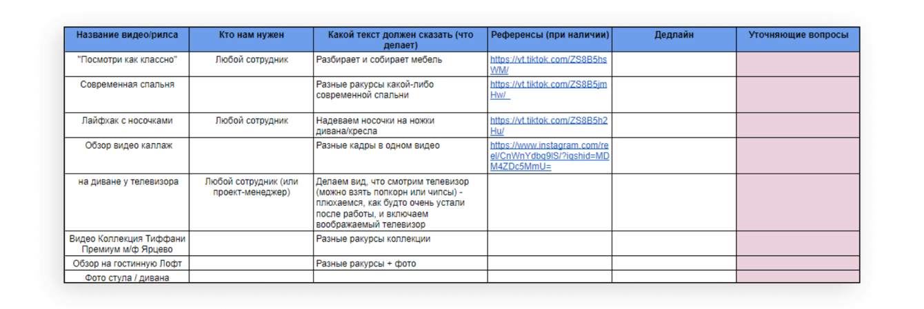 Периодически мы выезжали в мебельный центр на съемку контента. Заранее составляли техническое задание, в котором было прописано количество людей, которые нам нужны, текст, который они должны сказать, референс при наличии.