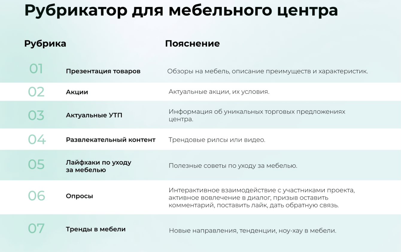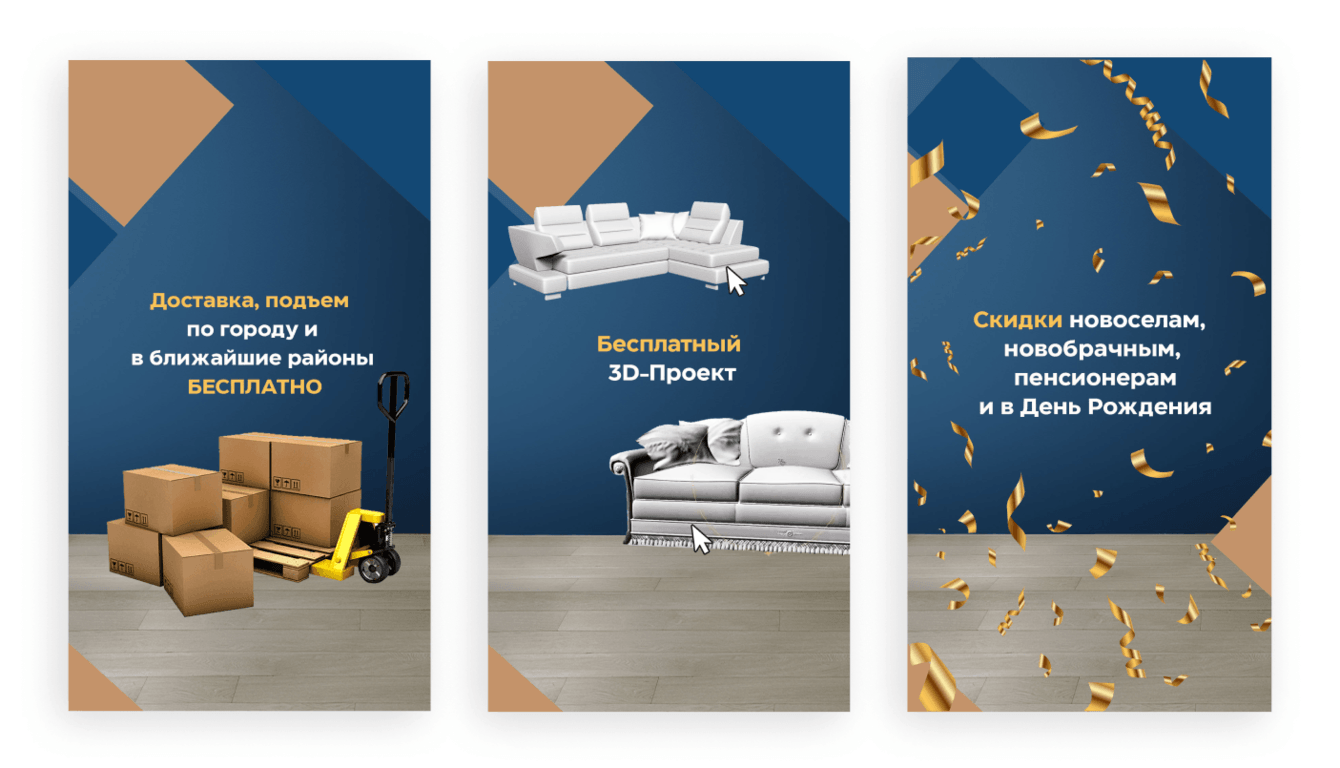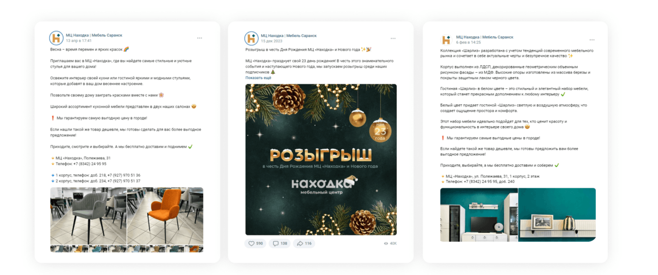 Создание уникального контента, который будет интересен целевой аудитории: фотографии мебели, видео обзоры, истории клиентов, информационные посты о новинках и акциях.