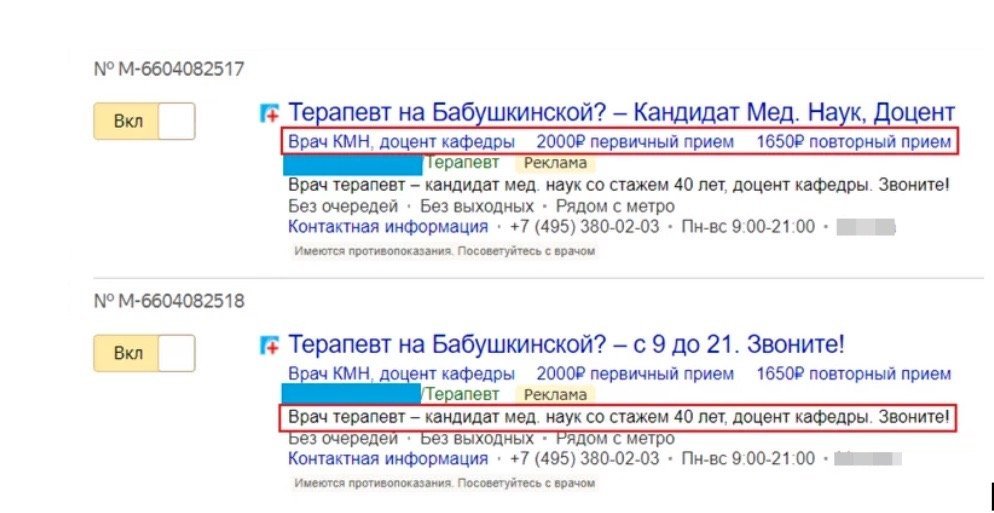 Затем мы взялись за тексты объявлений. Стратегия состояла в том, чтобы создать что-то, не просто краткосрочно привлекающее внимание, но и цепляющее человека настолько, чтобы он перешел к действию. Мы провели анализ и сегментацию рынка, изучили объявления конкурентов и в результате сформировали уникальные предложения, которые содержали популярный “Call to action” контент для медицинского сегмента. Такие объявления не только информируют о стоимости услуг (помогая сразу же отсеивать нецелевую аудиторию), но и подчеркивают преимущества нашего клиента. Да, мы рисковали снижением CTR, но цель была выше — увеличение конверсии и оптимизация расходов.