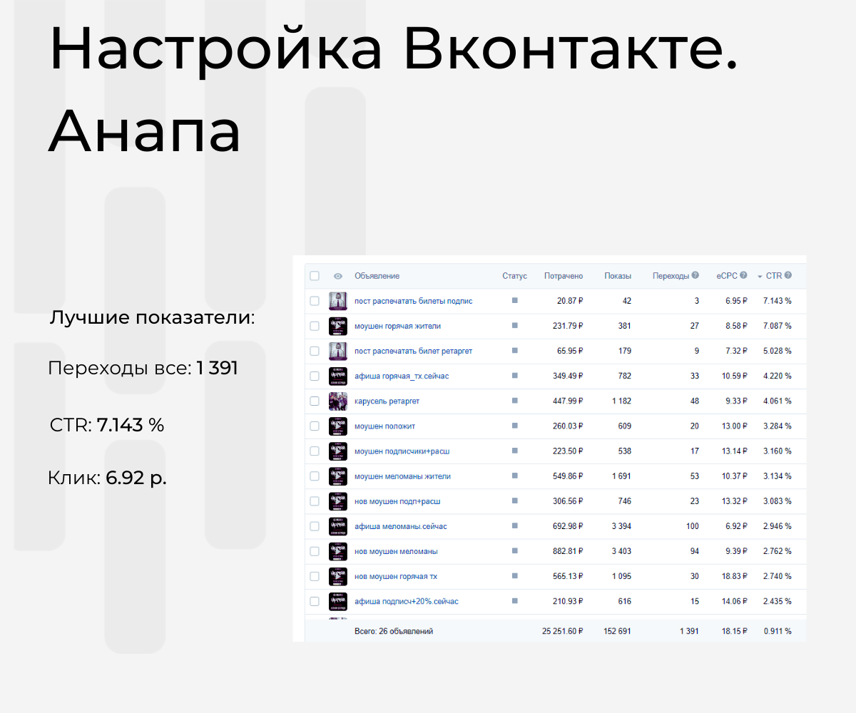 На Юге рекламную кампанию раньше чем за 2 недели до концерта запускать не эффективно,так как мы делаем акцент на отдыхающих. Предварительную рекламу, за 2 недели до основной можно настраивать по ключевым фразам по всей России, чтобы она показывалась тем, кто собирается на отдых.