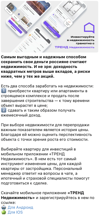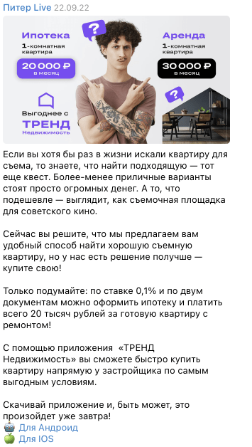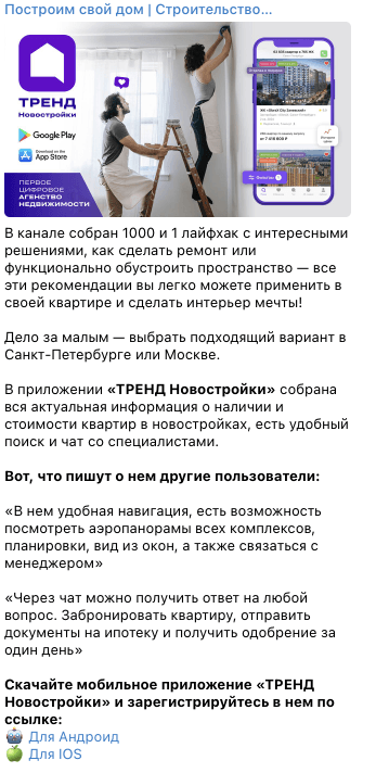 Агентство предлагает недвижимость в СПБ и МСК. Поэтому в проработке были региональные каналы в этих локациях, разные нишевые в тематике недвижимости, инвестирования, а также околоцелевые с семейной аудиторией и другие.
