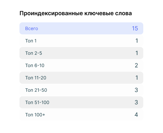 3. Общее количество индексируемых ключевых слов в разрезе по занимаемым позициям в выдаче App Store. Количество проиндексированных слов минимально — 15.