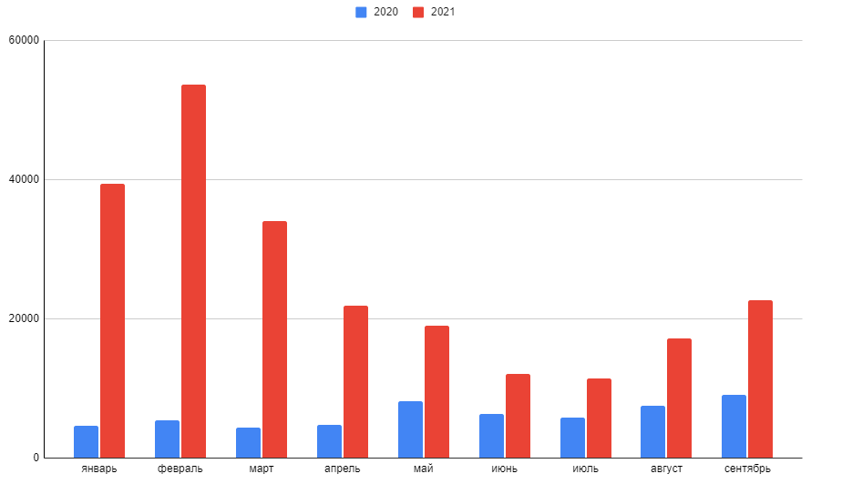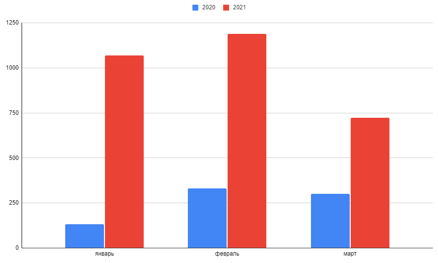 Сравнение трафика из поисковых систем за 2020 и 2021 год по месяцам. Пик посещаемости приходится на месяцы Январь, Февраль, Март.