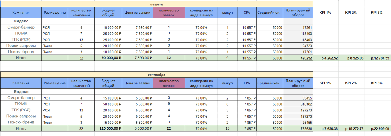 На начальном этапе всегда подготавливаем медиаплан и план запусков по рекламным кампаниям. В медийном плане просчитываем ориентировочную стоимость заказа и показатели ДРР, исходя из планируемого бюджета.