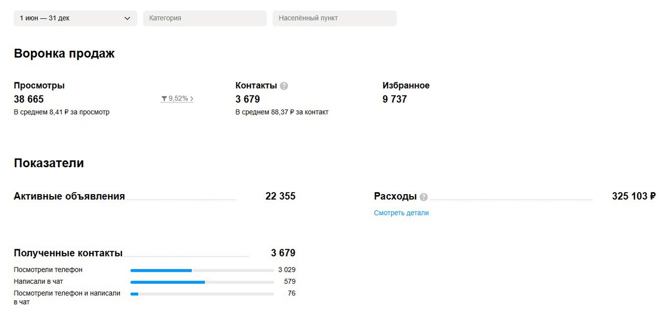Всего было получено 3 679 обращений со средней ценой в 88 рублей при общем бюджете 325 103 рубля.