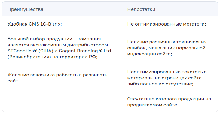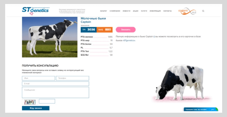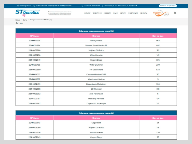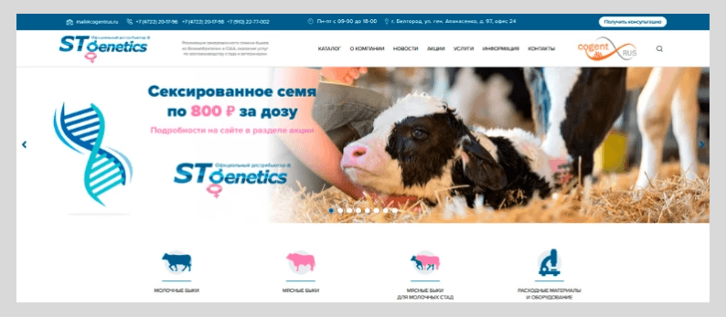 Компания «Коджент Рус» пришла к нам на продвижение в начале апреля 2020 года. Наш клиент – официальный, эксклюзивный дистрибьютор STGenetics® (США) и Cogent Breeding ® Ltd (Великобритания) на территории РФ и занимается реализацией семени быков из Великобритании и США, а также оказанием услуг по воспроизводству стада и ветеринарии.