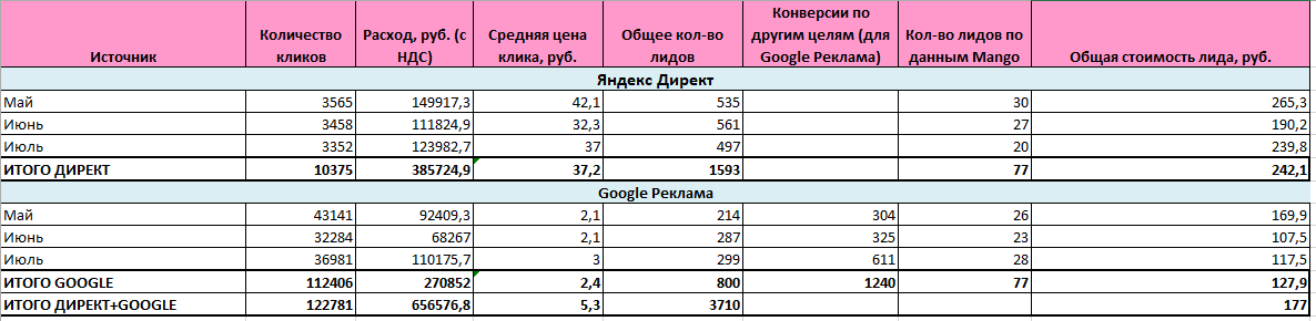 Цель по количеству лидов была достигнута через 2 недели после начала работы. Количество лидов росло от месяца к месяцу. В сумме за 3 месяца из обоих каналов трафика нам удалось привлечь 3710 заявок (количество заказов отчета e-commerce Яндекс.Метрики, количество звонков по данным MangoOffice, количество посещений точек продаж по данным РК Local). Увеличение заявок наблюдалось, в том числе в летние месяцы, которые для этого вида бизнеса (доставка пиццы) считаются «не сезоном». Средняя цена клика снизилась до 37,2 рублей в Директе и 2,4 руб. в Google. Средняя стоимость заявки составила 242 руб. в Директе и 127 руб. в Google.