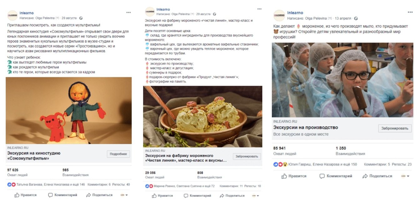 Клиентов на групповые программы на школьные экскурсии привлекали при помощи таргетированной рекламы в социальных сетях.