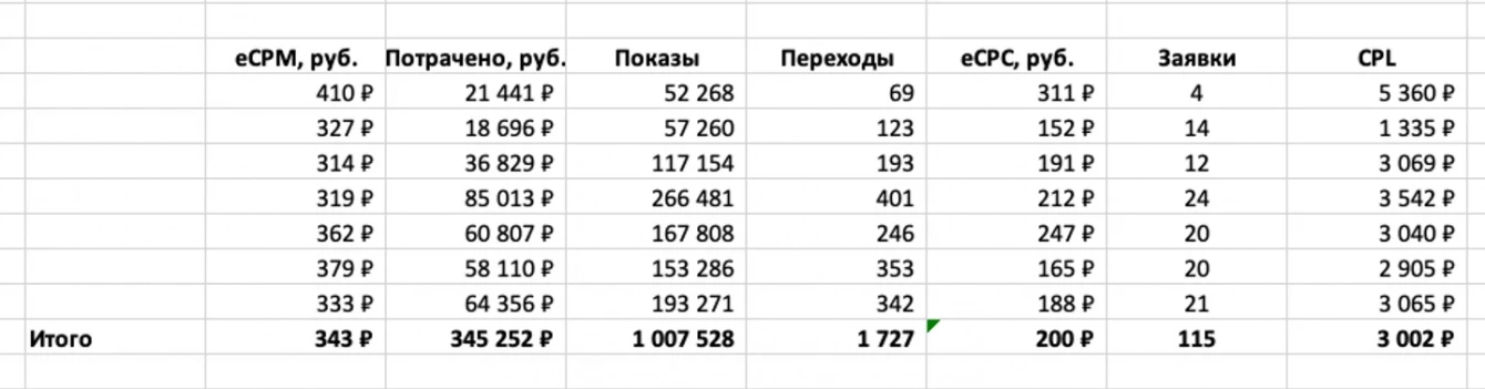 Лучше всего сработали ключи прямых запросов и теплые (касающиеся программы курса), ретаргетинг на посмотревших рекламу + позитив, группы конкурентов + расширение аудитории.