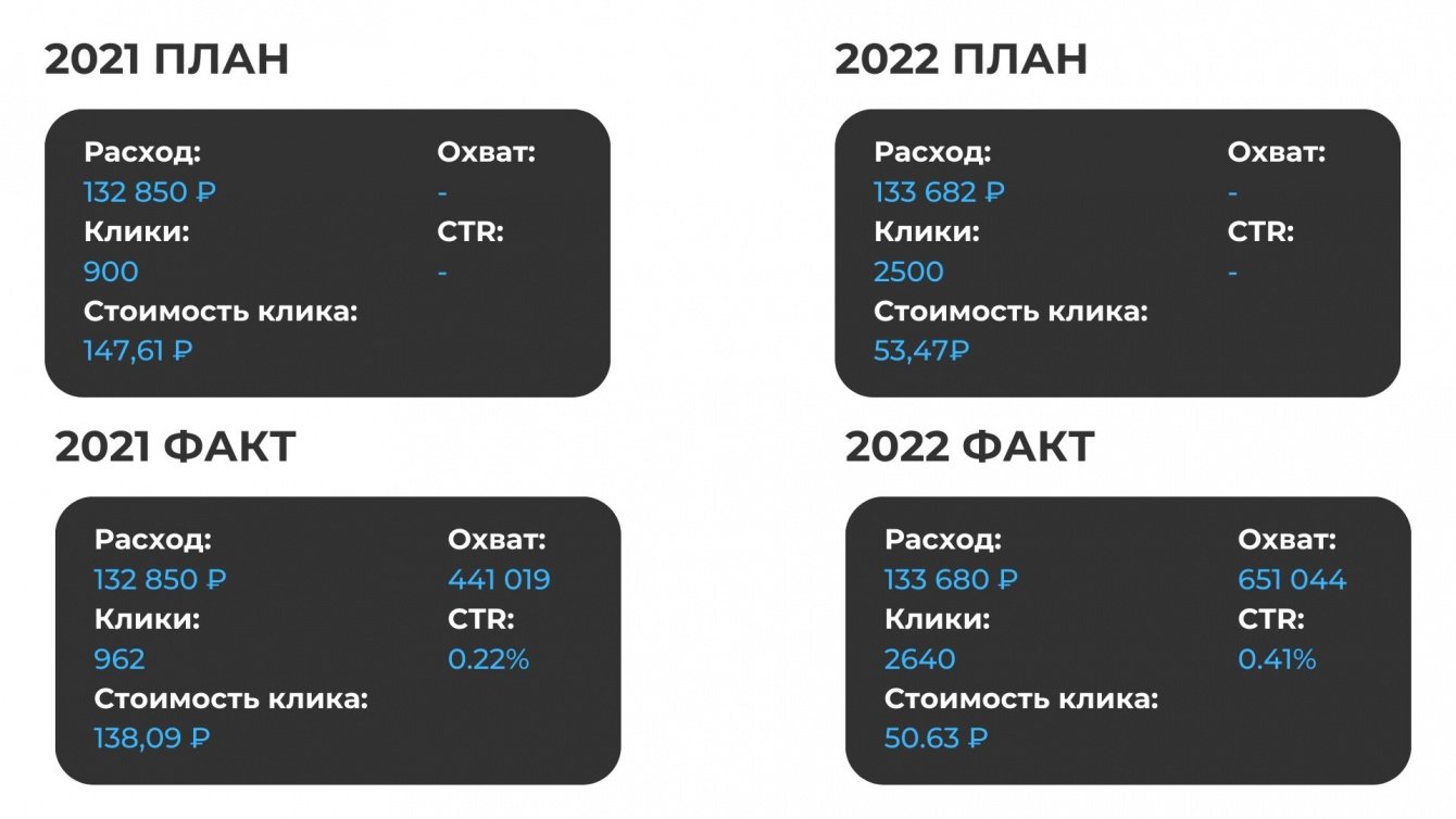 В оба года прогноз был сделан достаточно точно. Объем кликов и планируемый бюджет удалось выполнить полностью. Но как мы видим, разные подходы к подбору аудитории и стратегиям рекламных кампаний и креативов позволили улучшить следующие показатели: