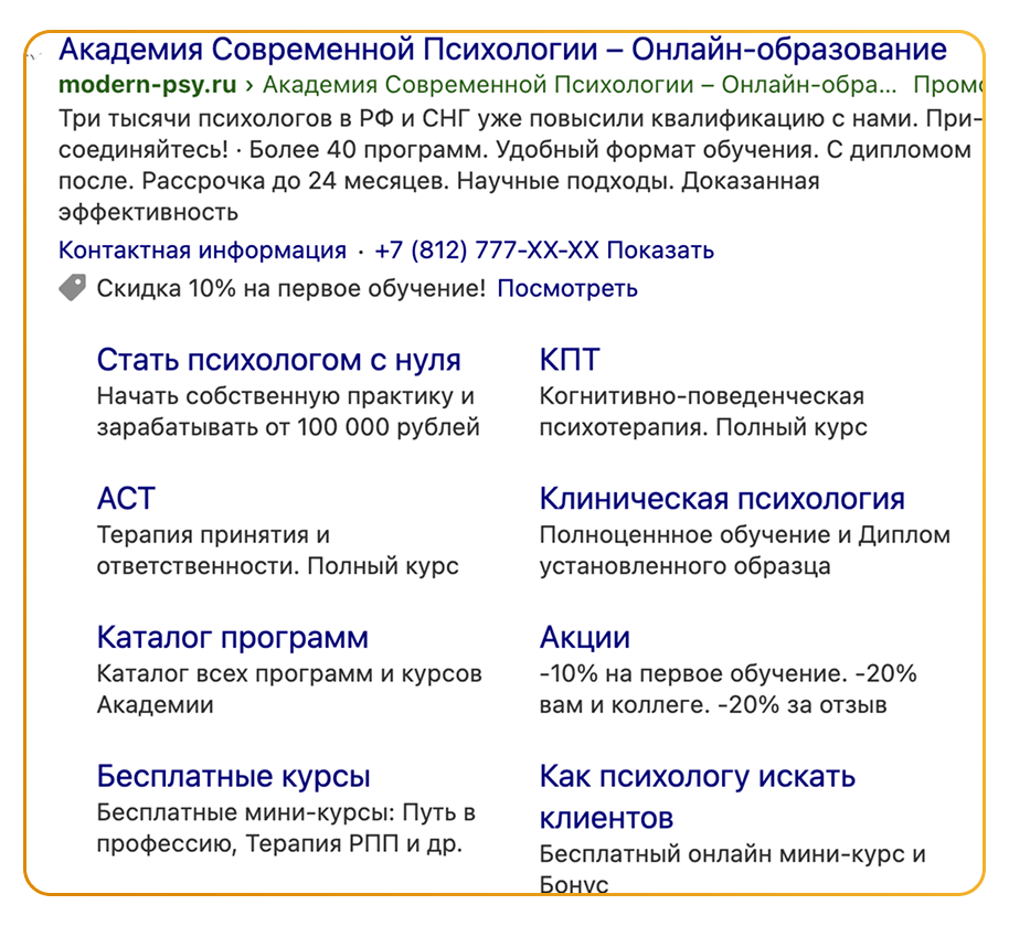 Брендовые кампании — когда человек ищет компанию заказчика по названию: например, «Академия современной психологии» или «психолог-консультант школа АСП». Это значит, что он уже знает о курсах заказчика и ищет именно их.