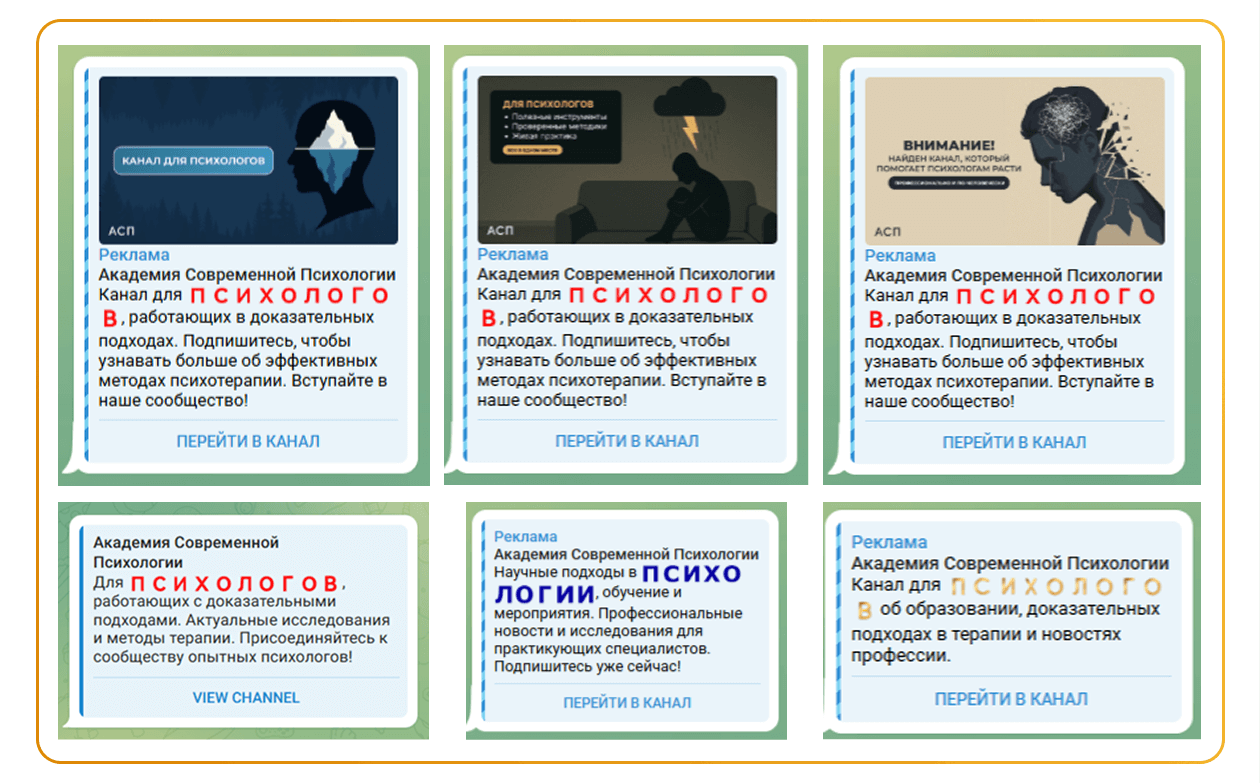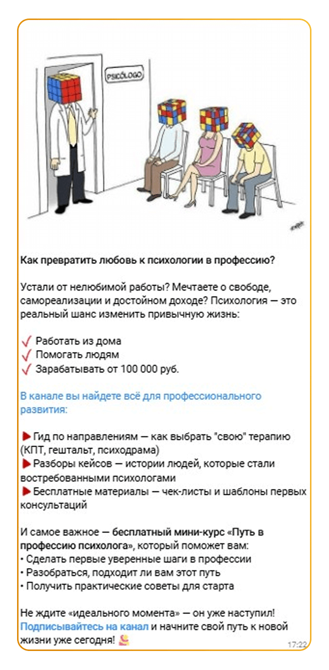 Каналы с полезным контентом по психологии — там собраны люди, которые регулярно интересуются темой, читают разборы, изучают методики. Мы рассчитывали, что такие подписчики будут открыты к углублённому обучению.