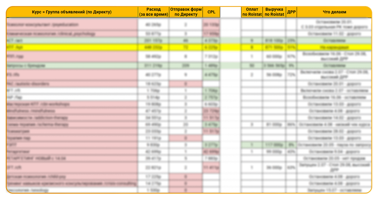 Чтобы понять, какие курсы действительно работают, создали сводную таблицу. В ней вручную сопоставляли данные из Яндекс. Директа и CRM. Фиксировали не только количество и стоимость заявок, но и конечные бизнес-метрики: число оплат и выручку по каждому курсу. Это позволило увидеть полную картину.