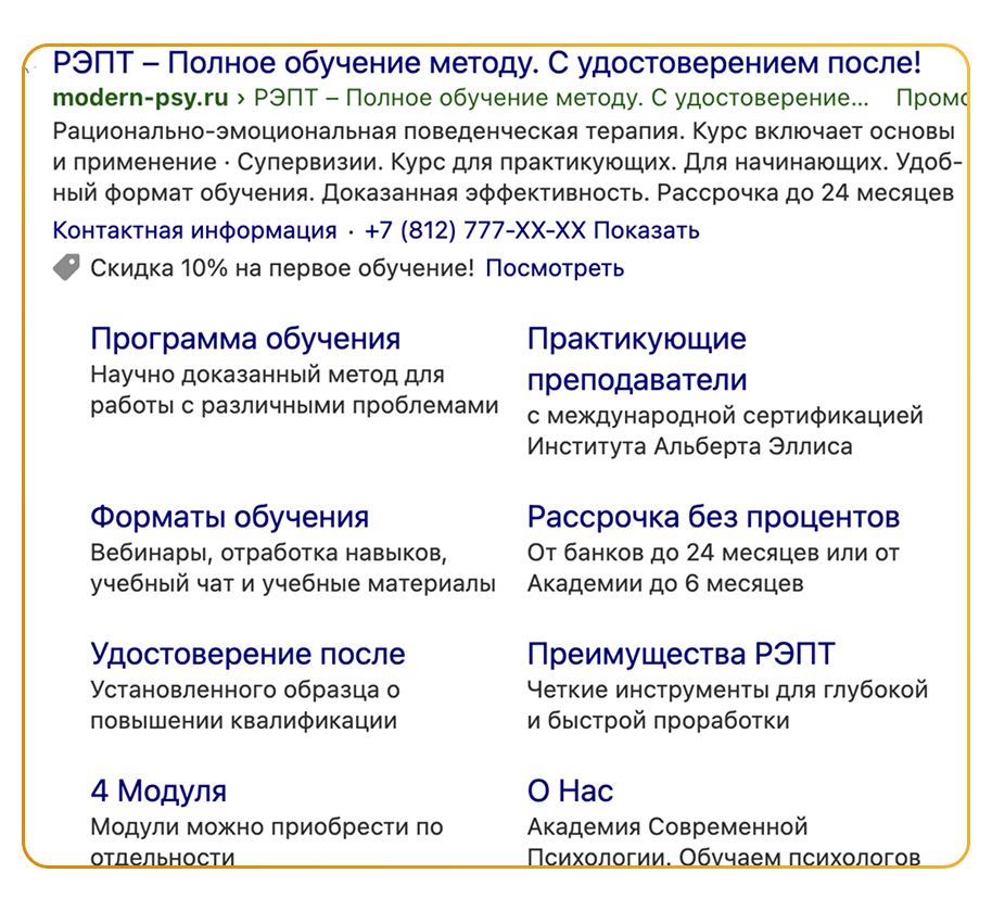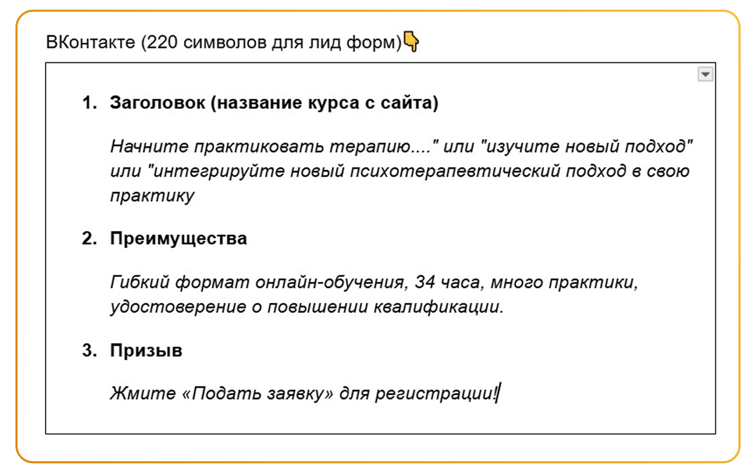 Во-вторых — необходимость говорить с психологами на их профессиональном языке. Общие фразы не работали, нужна была точная терминология. Стали изучать, как пишут эксперты, подмечали их формулировки и встроили в УТП: добавили «подтверждение НОЦ», «практические кейсы», «супервизию». То есть такая терминология была непонятна обычному человеку, поэтому он проходил мимо, но понятна нашей целевой аудитории.