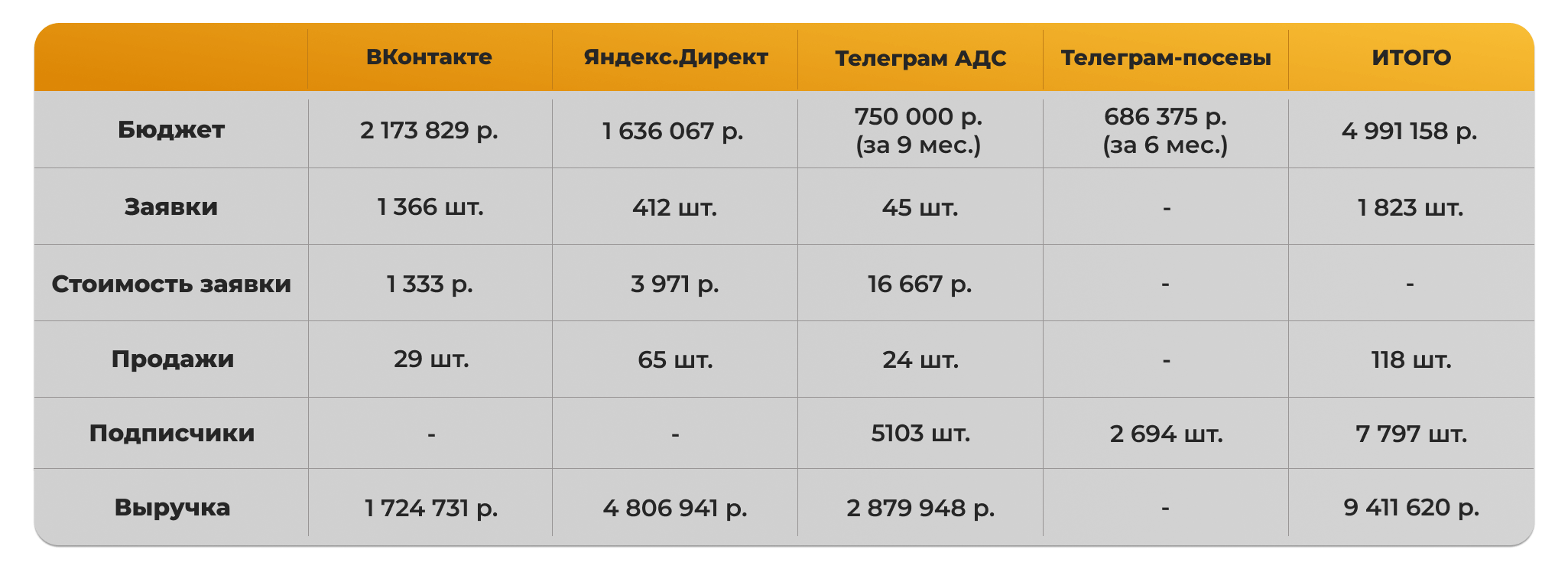Мы работали по четырем каналам трафика, потому что: у Яндекс. Директа своя логика, у ВКонтакте — своя, у Telegram — третья. Не везде подходит один и тот же подход, поэтому мы не гонимся за универсальной стратегией, а адаптируем всё под особенности канала.