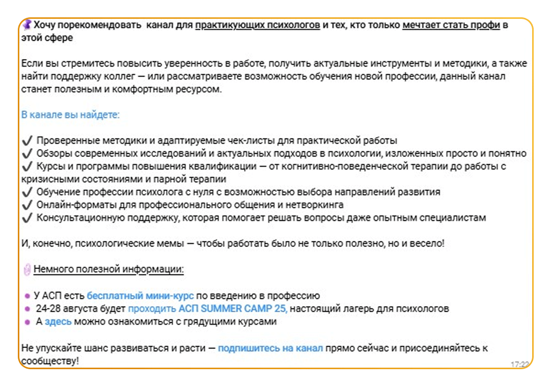 Авторские каналы практикующих психологов. Предполагали, что аудитория таких экспертов — это активные специалисты, которые заинтересованы в развитии.