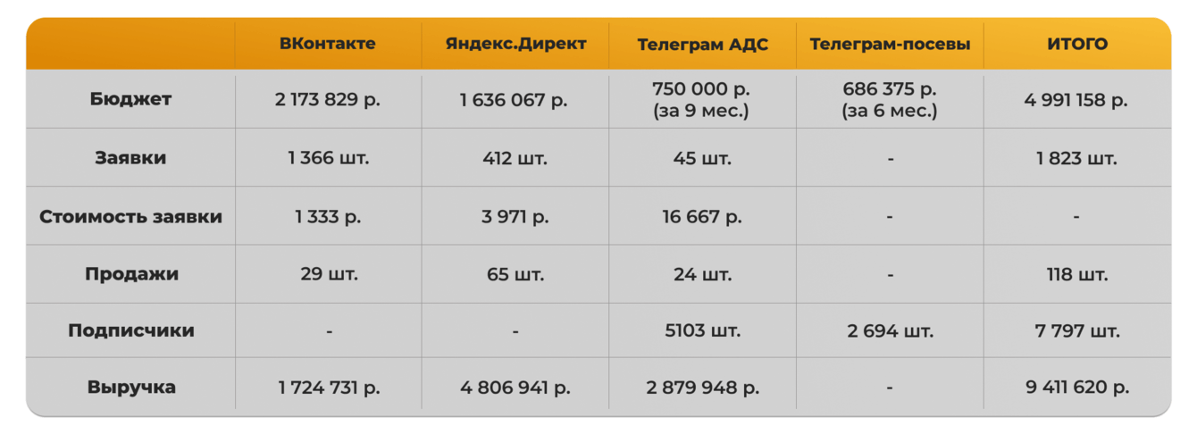 В следующих разделах подробно разберём, как выстраивали каждый канал и какие выводы сделали и что по итогу оставили в работе.
