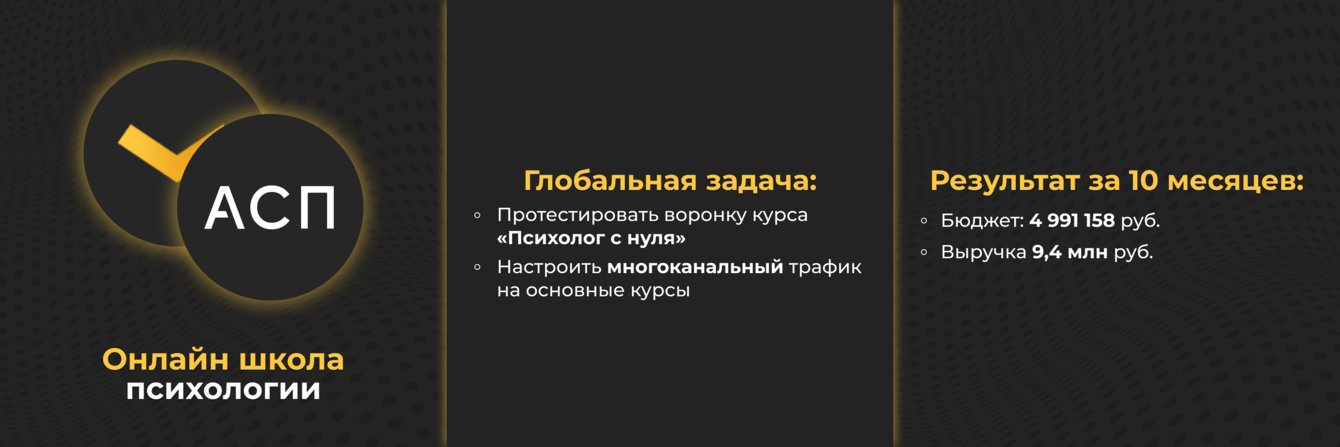 Заказчик обратился к нам в сентябре 2024 года с чёткой задачей: привлекать студентов на бесплатный мини-курс «Психолог с нуля» через ВКонтакте и Яндекс.Директ. Идея была понятной — найти людей без опыта, заинтересовать их профессией, дать базовые знания, а затем мягко перевести на дорогие программы повышения квалификации. Казалось, что воронка логична и масштабируема.